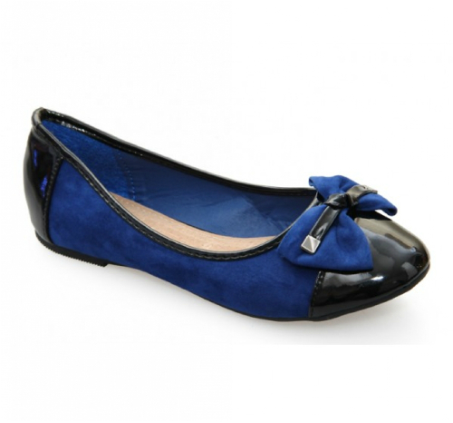 Balerini din piele intoarsa ecologica de culoare albastra, cu intarituri din piele ecologica lacuita neagra si funda aplicata, comozi, tineresti, potriviti la tinute casual cu jeans.