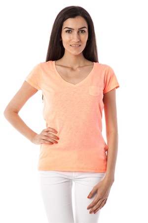 Tricoul de culoarea piersicii este intotdeauna o alegere potrivita pentru iesirile in oras cu prietenii sau pentru o plimbare in parc sub clar de luna.