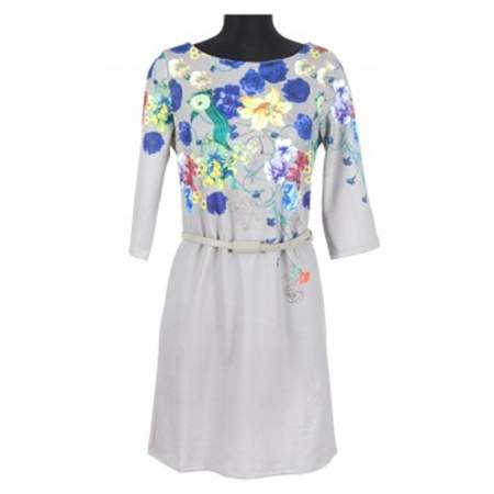 Rochie cu flori de zi gri S20726, model din colectia de toamna iarna La Femme 2013. Rochia este necaptusita, croiala dreapta si talia este marcata de o curea in ton cu rochia din inlocuitor. La spate rochia are un fermoar metalic de 15 cm.