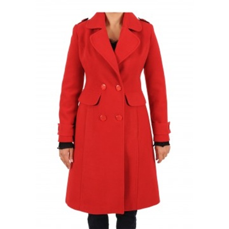 Palton rosu stofa groasa cu captuseala. Model cu rever si inchidere la doua randuri nasturi. Buzunare in cusatura si clapeta design.