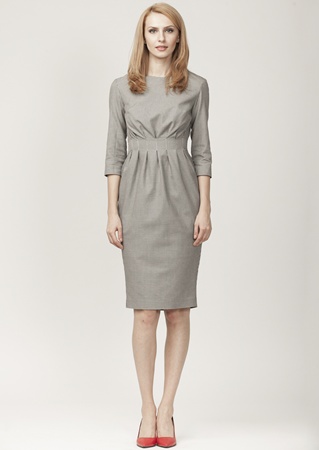 Rochia face parte din colectia '"Moja Cut" si este realizata din stofa. Modelul are pliuri in talie, maneca 3/4 iar lungimea este medie. Sistemul de inchidere: fermoar pe spate.
