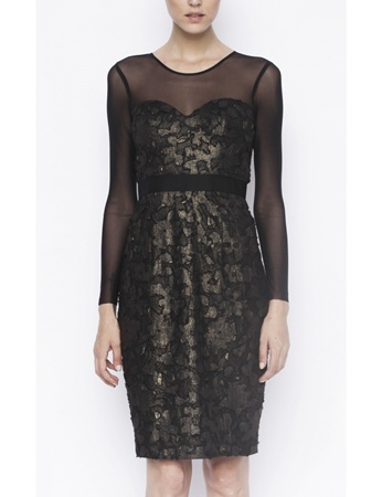 Rochie conica realizata din tesatura aramie cu flori, garnitura din tull negru, maneca lunga, talia accentuata cu banda ripsata neagra.