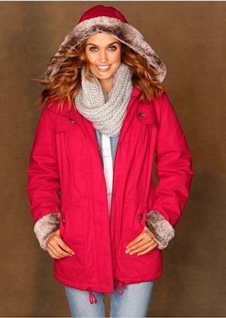 Geaca de iarna sic, cu gluga detasabila frumos ornata cu blanita moale, care se regaseste si la maneci. Cu o forma feminina, buzunare originale mari in fata si siret de strangere la tivul poalei.