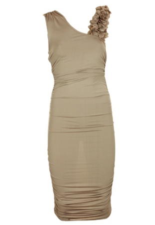 Rochie roz deschis cu bretele late, decolteu in V si aplicatii decorative pe umar.