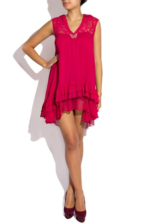 Rochie scurta din voal de matase cu gluga la spate si dantela.