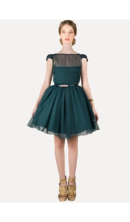 O rochita verde smarald, cu accesorii delicate de matase si cristal roz. Gingasa dar in acelas timp atragatoate prin jocul de transparente. Se poate purta atat cu juponul din tulle, pentru volum, cat si independent (juponul este detasabil).
