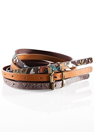 Un set minunat compus din 3 cureluse diferite: una simpls, una cu stantare gen sarpe si una cu material textil cu imprimeu floral. Toate curelele sunt prevszute cu catarame metalice cu patina.