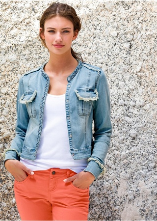 Geaca draguta din actuala colectie Rainbow, realizata din material de blug fin cu elemente decorative sub forma de franjuri sic. Model cu o forma scurta, buzunare cool aplicate pe piept.
