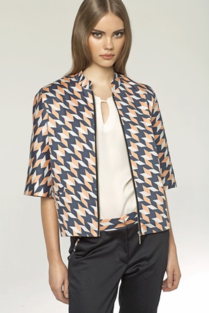 Este o jacheta cu un model geometric ce poate fi asortata atat la tinute casual cat si la cele elegante.