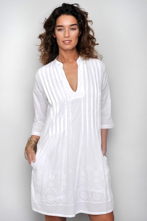 Rochie de vara, confortabila si subtire, din bumbac de culoare alba, cu maneca trei sferturi, decolteu in V si broderie decorativa.