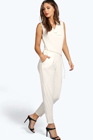 Salopeta moderna, de culoare alba, cu lant in talie si decolteu cascada este un must have in tendintele anului 2016.
