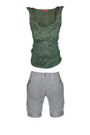 Cand caldura de afara "cere" cat mai putine haine sau cel putin cat mai lejere, purtati un top verde, decoltat si "racoros" alaturi de o pereche de pantaloni scurti. Veti capata o imagine "sportiva" dar puteti la fel de bine sa mergeti asa la cumparaturi de exemplu. Bluza TinaR - 79 RON Pantaloni Prestij - 499 RON