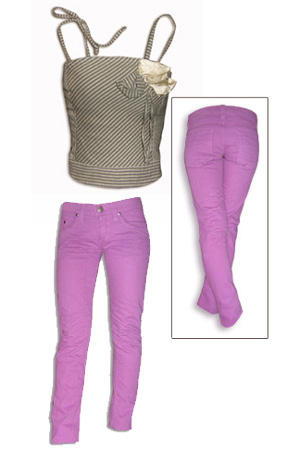 Categoria fancy! Sa nu uitam sa ne pastram feminine, mai ales ca vara are mii de variante ajutatoare in sensul acesta: daca esti invitata la o petrecere pe plaja sau planifici vreo sesiune intensa de clubbing sau vrei pur si simplu sa-l iei prin invaluire, iata raspunsul: alege un top mulat, in dungi si nunate metalizate, sofisticat garnisit cu o aplicatie floral abstracta, in stil retro. Poarta-l cu incredere la o pereche de jeansi skinny ( inca se mai poarta, asa ca profita!), insa in culori electrizant-frapante, marca anilor 80. Lila intens in cazul acestora de fata, dar poti alege si ciclamen, galben, verde, mov sau rosu sisa ne povestesti dupa! Noi am ales top ZIGGO 120 RON si jeansi ZIGGO 180 RON