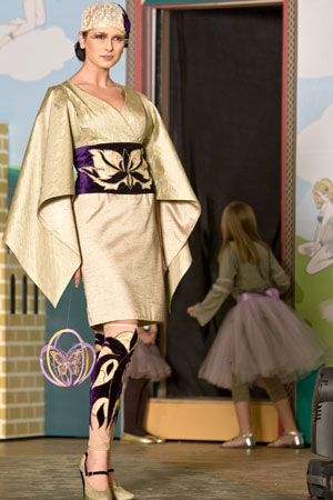 Una dintre trasaturile definitorii ale colectiei este bogatia cromatica, piesele reprezentand un intreg colaj de elemente pictate sau aplicate (elemente din lumea vegetala, papusi, diferite miniaturi) asociate unor materiale inedite (piele lacuita, materiale serigrafiate, catifea, rips, brocard, pluta, dantela, margele din sticla de Murano, cristale Svarowski, perle sau plastic transparent). Foto: Dan Samoila
