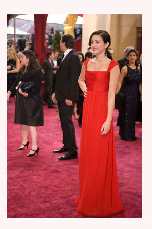 10. MILEY CYRUS Tanara vedeta, de numai 15 ani, incepe sa isi contureze un stil personal, care probabil foarte curand o va impune drept o noua fashion icon. Ea a demonstrat ca are stil atat la premiile Grammy, cat si la decernarea premiilor Oscar. De data aceasta, Miley a ales o rochie rosie, lunga, foarte eleganta. Rochia apartine ultimei colectii a marelui creator de moda, Valentino. Miley a optat pentru cercei stil candelabru, din aur, cu diamante, de la Neil Lane. Copyright imagini A.M.P.A.S