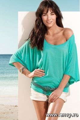 Propunere: tricou cu maneci scurte largi si guler rotund, pret 38.49 lei; este disponibil in magazinele Fashion Lab.