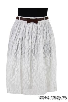 Dantela este rafinata si senzuala, perfecta pentru o tinuta speciala. Este la moda si in sezonul rece, asadar poart-o cu stil si eleganta. Daca te pregatesti pentru un eveniment deosebit, combina o fusta din dantela alba cu un top nude. Sunt in trend si contrastele tari, asadar si negrul poate fi o alegere potrivita. Model: fusta din dantela; se incheie in talie cu o curea din piele si este disponibila in magazinele La Femme, pret 140 lei.