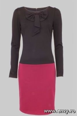 Rochie midi din tricot gros, realizata in contrast cromatic de doua culori; are maneca lunga si gulerul este decorat cu o fundita. Este disponibila in magazinele Nissa, pret 69.50 lei.
