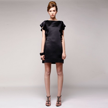Rochie mini de cocktail, din satin duchesse, cu croi geometric, tiv intarit, buzunare ascunse in cusatura si maneci tip volan melc.Pret: 583 lei