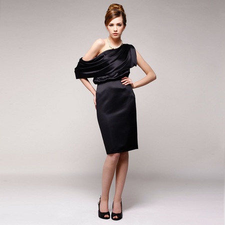 Rochie de cocktail Agnes Toma, cu efect de fusta si bluza, cu bust din satin de matase cu drapaj asimetric pe un umar si fusta conica din satin duchesse; se recomanda curea in talie.Pret: 697 lei