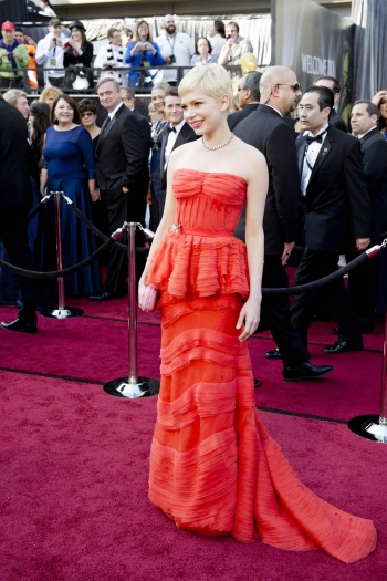 13. Michelle Williams Alaturi de tinutele stralucitoare, albe sau nude si rochiile in culori aprinse au facut senzatie pe covorul rosu. In aceasta categorie se inscrie si rochia Louis Vuitton purtata de Michelle Williams.