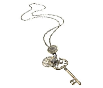 Din metal. Inchizatoare tip carabina. Pandantive flexibile in forma de cheie, disc stantat, cruce cu strasuri albe. Lungime cca. 82 cm. Lungime pandantiv cca. 9 cm.