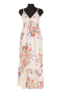 Rochie flori rosii din bumbac si captuseala din bumbac. Model decolteu V petrecut cu banda elastica spate si bretele reglabile. Pe fata are o banda sub bust si volan terminatie. Vara aceasta designarii au cazut prada rochiilor lungi vaporoase, fluide, care evidentiaza forma corpului intr-un mod subtil si seducator. Alege in aceasta vara rochii lungi pentru un look indraznet din noua colectie La Femme 2012. Lungime linie sub brat-terminatie 120 cm. Compozitie fata si captuseala: 100% bumbac