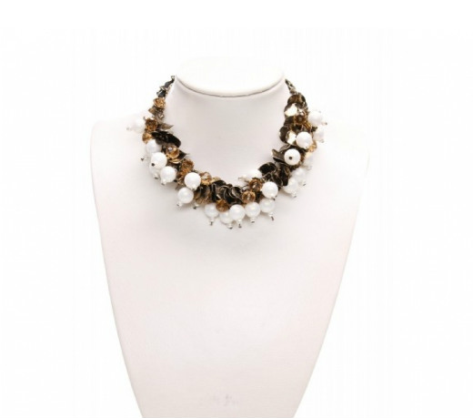 Colier Cafe Noir confectionat din zale metalice cu perle sidefate si banuti cromati decorativi