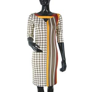 Rochie cu maneca 3/4, cambrata, decorata cu dungi multicolore, verticale.