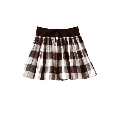 Fusta este scurta, realizata dintr-un material gros cu carouri.