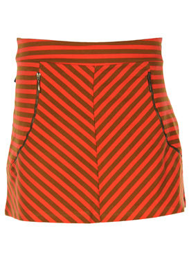 Fusta este realizata dint-un material subtire cu dungi maro si rosii.