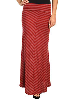 Fusta este realizata dintr-un material elastic de culoare rosie, dungat.