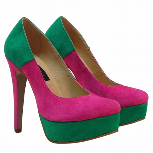 Pantofi colorblock din piele naturala verde smarald si fuchsia. Sunt potriviti pentru o tinuta fun in noaptea de Revelion. Sunt usor de purtat datorita platformei inalte.