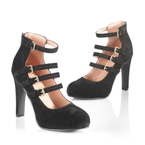 Pantofi de piele intoarsa, cu patru curele care-ti mangaie piciorul! Catarama de metal are culoarea aramei patinate iar fermoarul din spate le dau un boost de farmec!