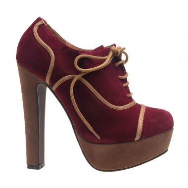 O pereche eleganta de botine din piele ecologica intoarsa la exterior intr-o culoare superba de bordo si khaki avand model din material textil bej si piele ecologica in interior. Acestea se inchid cu siret in partea din fata.