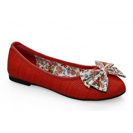 Balerini din panza de culoare rosie, cu funda aplicata cu imprimeu floral, un must have in garderoba fiecarei femei in acest sezon. Se pot asorta cu culori complementare din natura precum verde si albastru, sau cu culori nude si nuante de maro.