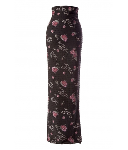 Fusta lunga Each Night, din tricot de bumbac negru cu imprimeu floral, cu talie inalta si fermoar pe toata lungimea spatelui iti va da multa suplete siluetei.