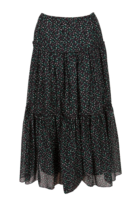 Fusta are elastic in talie. Materialul fluid se onduleaza delicat in mers. Poate fi accesorizata cu o vesta dinn denim si balerini.