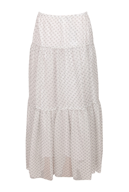 Fusta are elastic in talie. Materialul fluid se onduleaza delicat in mers. Poate fi accesorizata cu o vesta dinn denim si balerini.