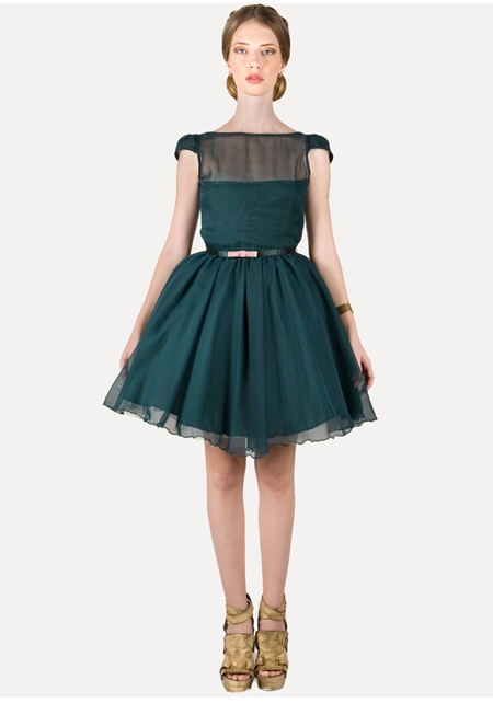 O rochita verde smarald, cu accesorii delicate de matase si cristal roz. Gingasa dar in acelas timp atragatoate prin jocul de transparente. Se poate purta atat cu juponul din tulle, pentru volum, cat si independent (juponul este detasabil).