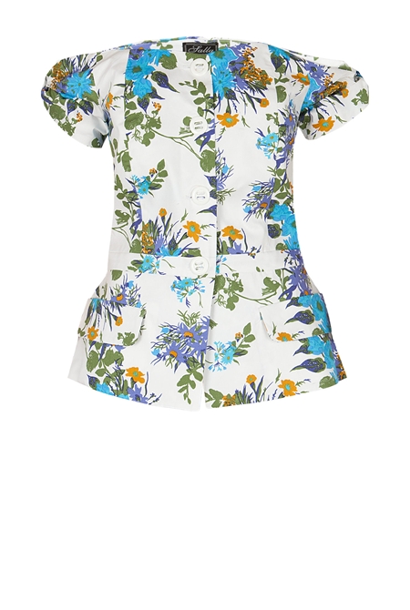 Sacou din bumbac fara umeri. Manecile sunt scurte prinse intr-o funda. Se inchide cu nasturi si are 2 buzunare de forma cu clapeta.