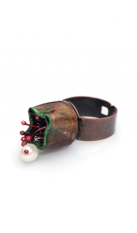 Inel din cupru cu patina verdigris, rasina incolora & verde, perle de apa dulce. Baza este metalica, reglabila, cu diametrul interior initial de 18 mm.