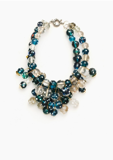Colierul statement este realizat din margele transparente si albastre. Acesta a fost lucrat manual. Produsul este confectionat din margele din sticla, cu insertii de lanturi sau elemente metalice. Colierul este ajustabil.