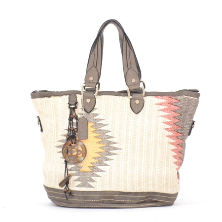 Geanta din rafie, insertii de material textil si piele ecologica. Are doua manere pentru a fi tinuta in mana si o bretea de umar din material textil, detasabila si reglabila.