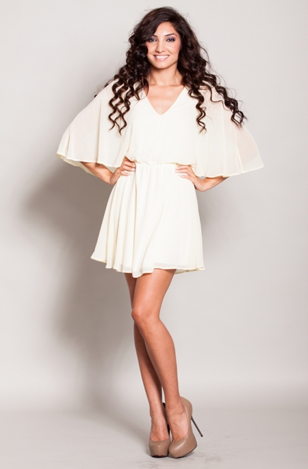 Rochia are un decolteu discret in V si banda elastica in jurul tailei. Este fluida, vaporoasa, ideala pentru ocaziile speciale din timpul verii. Accentul cade pe decolteu si pe manecile cu croi deosebit.