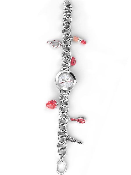 Vanity este un accesoriu spectaculos, in ciuda designului simplu. Nu este numai un ceas. Vanity este o bijuterie funky si imbina utilul cu placutul. De bratara sunt atarnate mici talisame care reprezinta acele trucuri feminine de infrumusetare, de la ruj la perie de par!