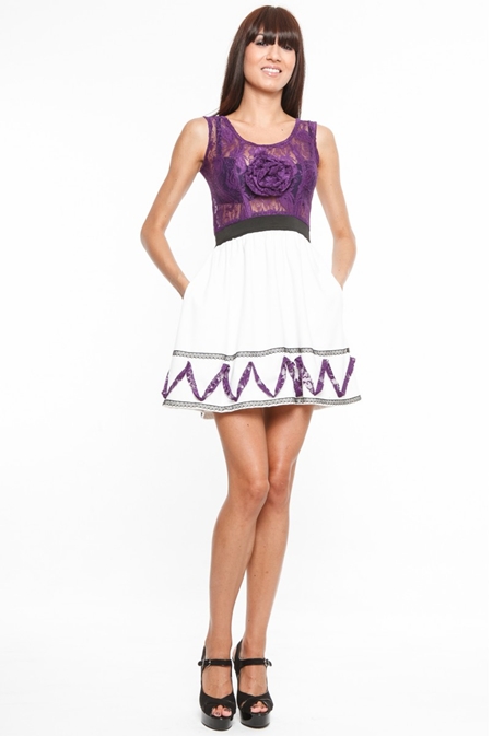 Partea de sus a rochiei este croita din dantela transparenta. O poti purta cu o dublura alba, in ton cu poalele. Daca vrei o tinuta mai indrazneata, poarta aceasta rochie cu un sutien mov.