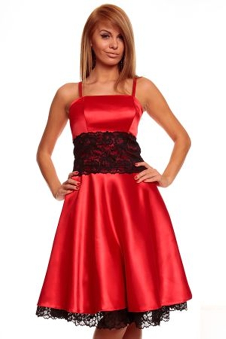 Rochia este taiata drept deasupra bustului si are bretelute subturi, ajustabile. Este captusita, are un jupon de tul care da amploare fustei, iar in talie si la marginea jupei are o dantela foarte frumoasa, de culoare neagra.