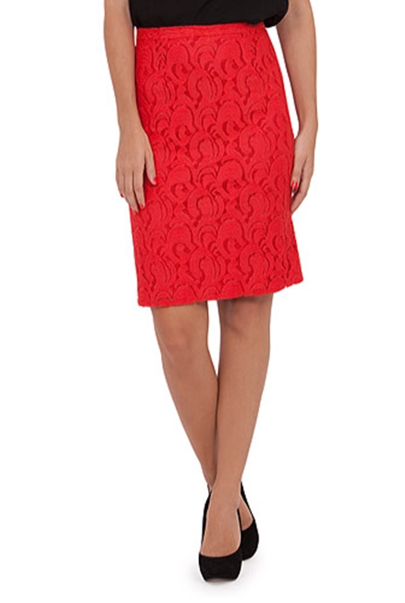 Fusta rosie din dantela are croiala dreapta si dublura in acceasi nuanta. Piesa se inchide cu fermoar ascuns pe mijloc spate.