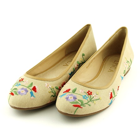 Balerini bej cu model floral, foarte potriviti pentru tinute casual chic. Poarta-I cu fuste largi, pana la genunchi si tricou cu maneci incretite.